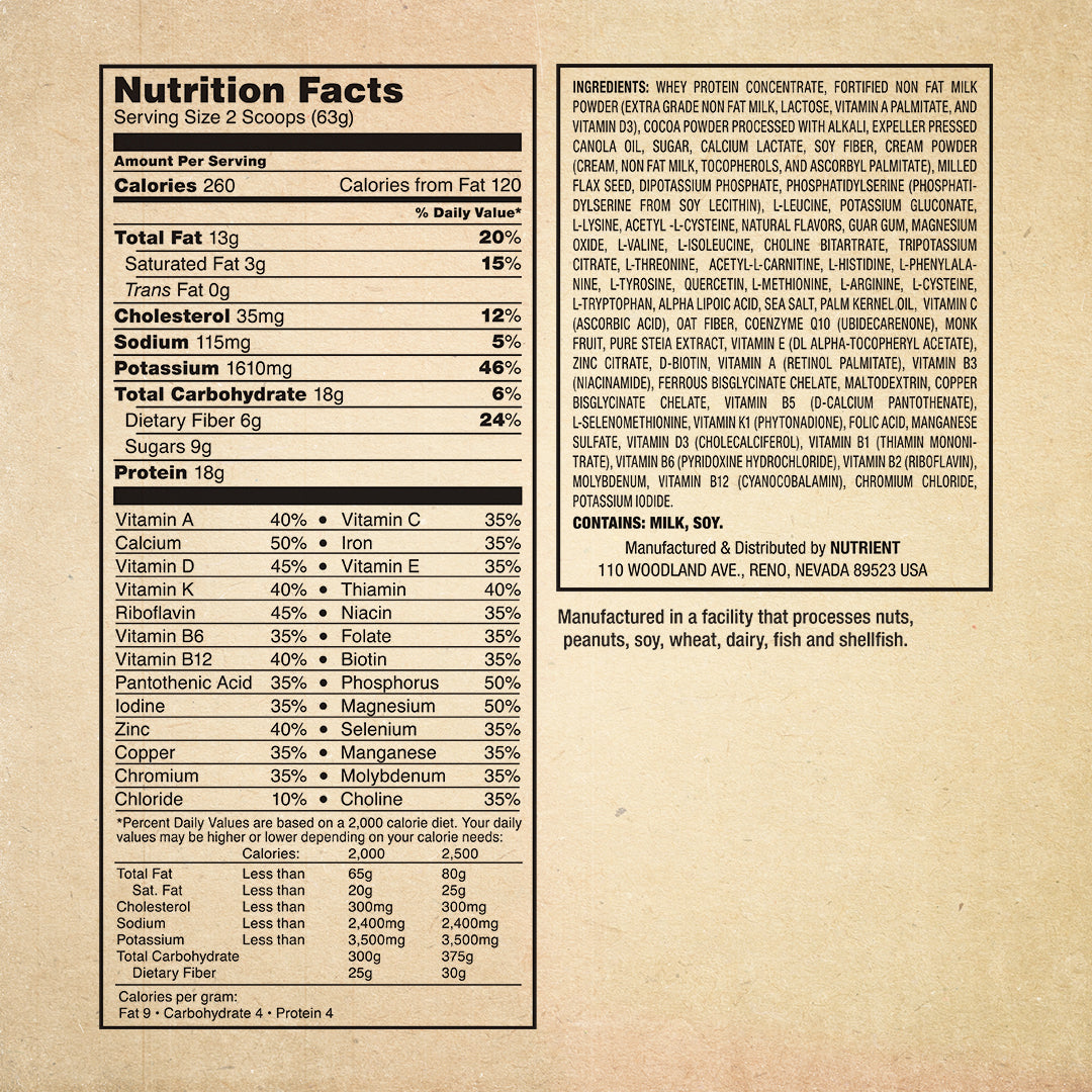 Nutrient Survival Shake Blend (Whey Protein Concentrate, Nonfat Milk, Cocoa Powder Processed With Alkali, Expeller Pressed Canola Oil, Cane Sugar, Soluble Maize Fiber, Natural Flavor, Cream Powder, Milled Flax Seed, Guar Gum, Lactose, Sunflower Lecithin, Purified Sea Salt, Monk Fruit, Stevia Leaf Extract), Nutrient Survival Mineral Blend (Calcium Lactate, Dipotassium Phosphate, Potassium Gluconate, Magnesium Oxide, Tripotassium Citrate, Zinc Citrate Dihydrate, Ferrous Bisglycinate Chelate, Copper Gluconate, L-Selenomethionine, Manganese Sulfate, Molybdenum, Chromium Chloride, Potassium Iodide), Nutrient Survival Amino Acid Blend (L-Leucine, L-Lysine, L-Valine, L-Isoleucine, L-Threonine, L-Histidine, L-Phenylalanine, L-Tyrosine, L-Methionine, L-Arginine, L-Cysteine, L-Tryptophan), Nutrient Survival Supplement Blend (N-Acetyl-L-Cysteine, Phosphatidylserine, Hesperidin, Acetyl-L-Carnitine, Alpha-Glycerylphosphorylcholine, Quercetin, Alpha Lipoic Acid, Beta Caryophyllene, Coenzyme Q10 (Ubidecarenone)), Nutrient Survival Vitamin Blend (Vitamin C (Ascorbic Acid), Vitamin E (DL Alpha-Tocopheryl Acetate), D-Biotin, Vitamin A (Retinyl Palmitate), Vitamin B3 (Niacinamide), Maltodextrin, Vitamin B5 (D-Calcium Pantothenate), Vitamin K1 (Phytonadione), Vitamin D3 (Cholecalciferol), Folic Acid, Vitamin B1 (Thiamin Mononitrate), Vitamin B6 (Pyridoxine Hydrochloride), Vitamin B2 (Riboflavin), Vitamin B12 (Cyanocobalamin))