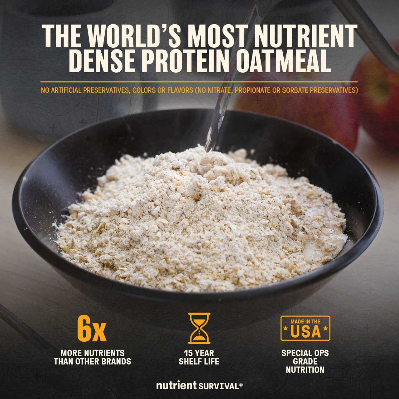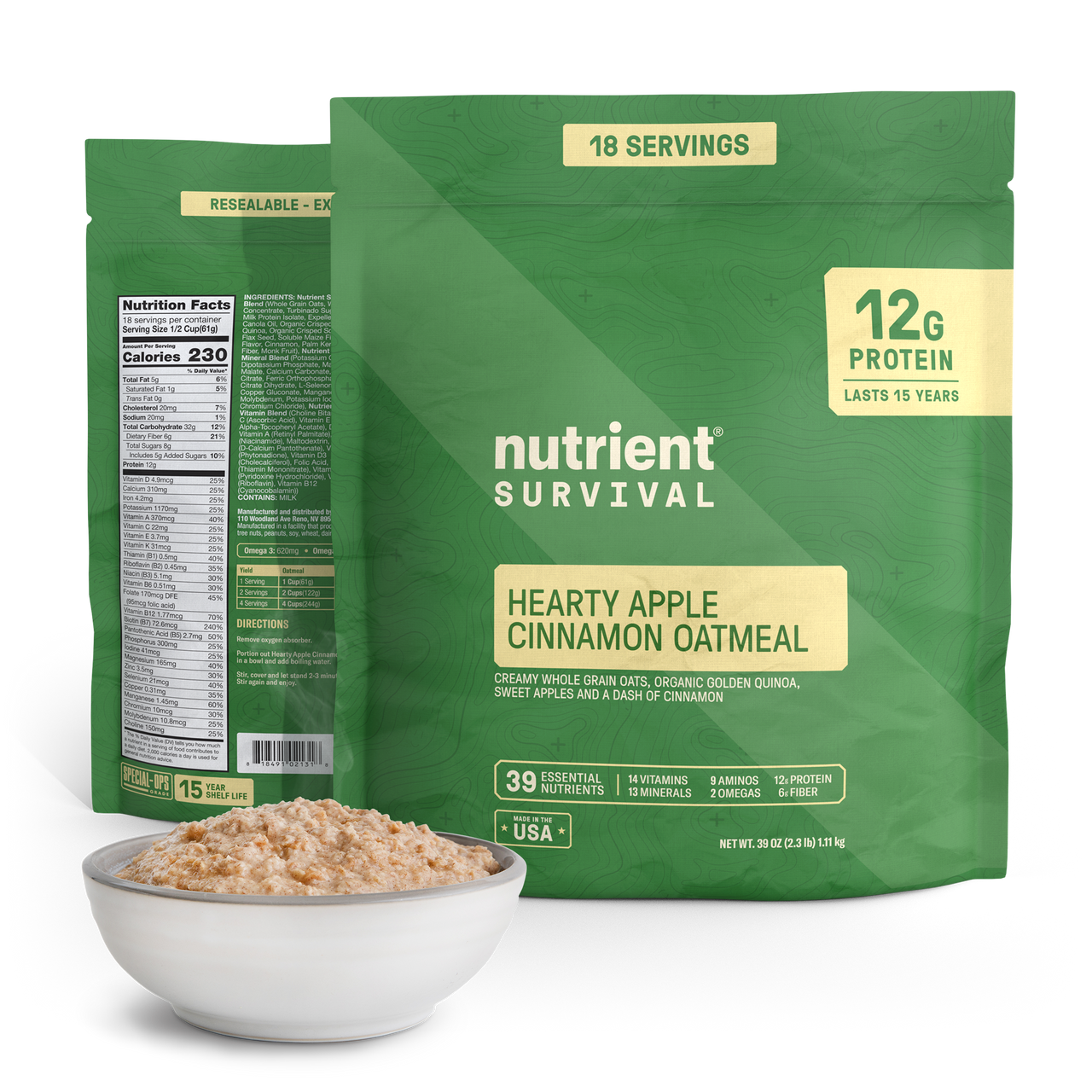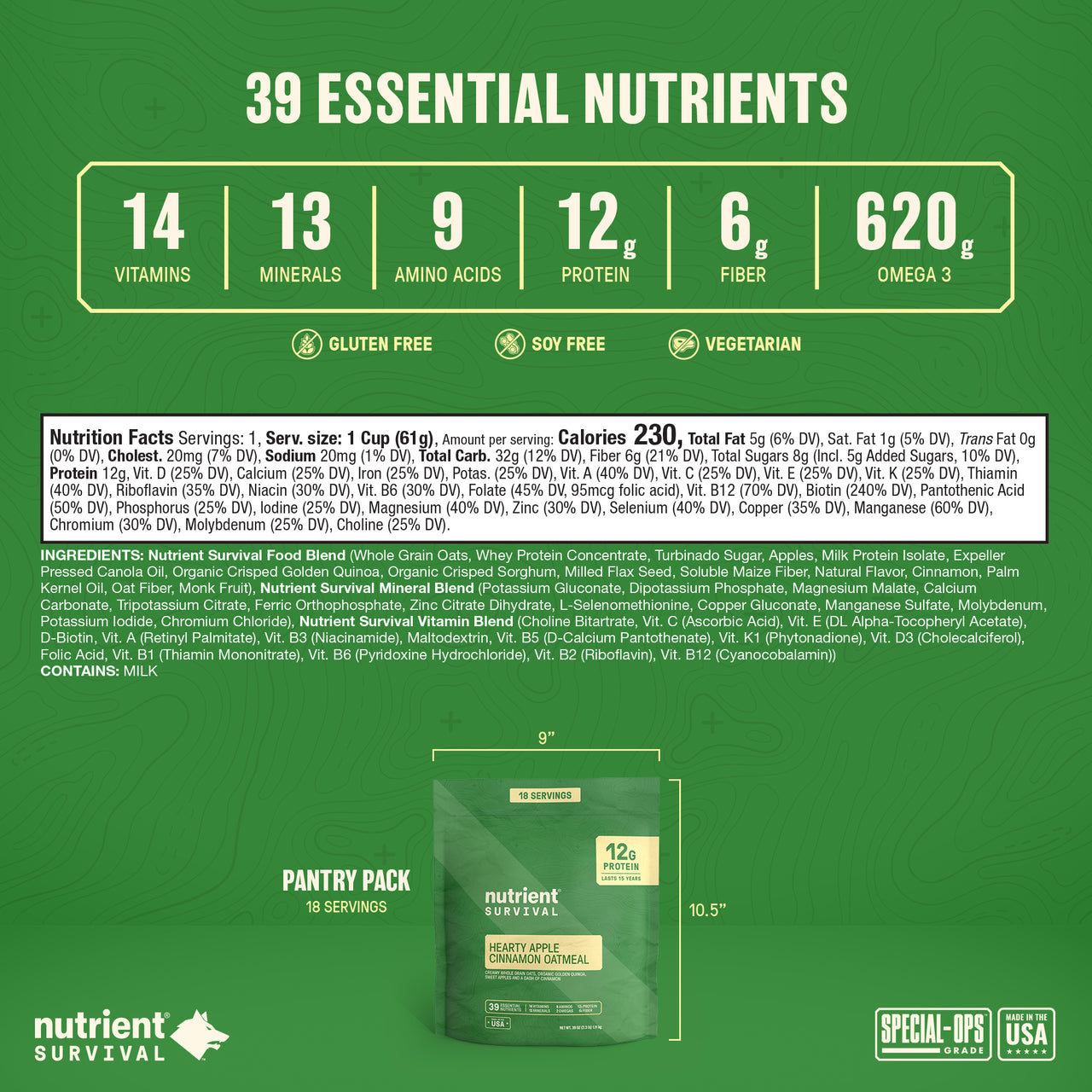 Nutrient Survival Food Blend (Whole Grain Oats, Whey Protein Concentrate, Turbinado Sugar, Apples, Milk Protein Isolate, Expeller Pressed Canola Oil, Organic Crisped Golden Quinoa, Organic Crisped Sorghum, Milled Flax Seed, Soluble Maize Fiber, Natural Flavor, Cinnamon, Palm Kernel Oil, Oat Fiber, Monk Fruit), Nutrient Survival Mineral Blend (Potassium Gluconate, Dipotassium Phosphate, Magnesium Malate, Calcium Carbonate, Tripotassium Citrate, Ferric Orthophosphate, Zinc Citrate Dihydrate, L-Selenomethionine, Copper Gluconate, Manganese Sulfate, Molybdenum, Potassium Iodide, Chromium Chloride), Nutrient Survival Vitamin Blend (Choline Bitartrate, Vitamin C (Ascorbic Acid), Vitamin E (DL Alpha-Tocopheryl Acetate), D-Biotin, Vitamin A (Retinyl Palmitate), Vitamin B3 (Niacinamide), Maltodextrin, Vitamin B5 (D-Calcium Pantothenate), Vitamin K1 (Phytonadione), Vitamin D3 (Cholecalciferol), Folic Acid, Vitamin B1 (Thiamin Mononitrate), Vitamin B6 (Pyridoxine Hydrochloride), Vitamin B2 (Riboflavin), Vitamin B12 (Cyanocobalamin))